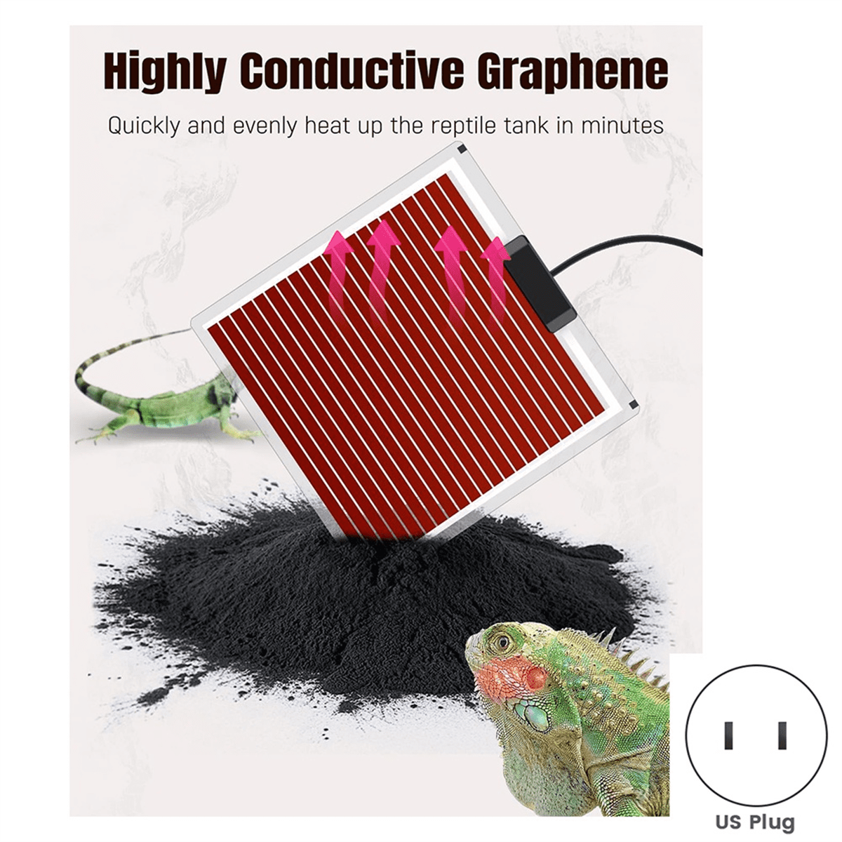 - The use of graphene is used as heating materials. The heating pad of the reptile has a high heat conductivity and a longer service life.Quickly and evenly heating the glass box within a few minutes.Make your crawling animals comfortable and