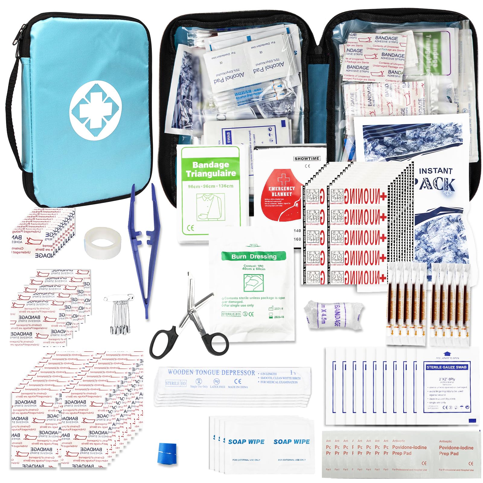 - First Aid Kit Must Have Essentials -- Convenient waterproof first aid kit with plastic compartments for quick and easy access to what you need (The zipper edge is not waterproof). Contains 300 pieces of basic daily first aid necessities such as cotton swabs, band aids, burn dressings, tongue depressors, bandages, gauze sheets, safety pins, triangular bandages, instant ice packs, scissors, plastic tweezers, etc. These home first aid kits are perfect for business trips, outdoor activities