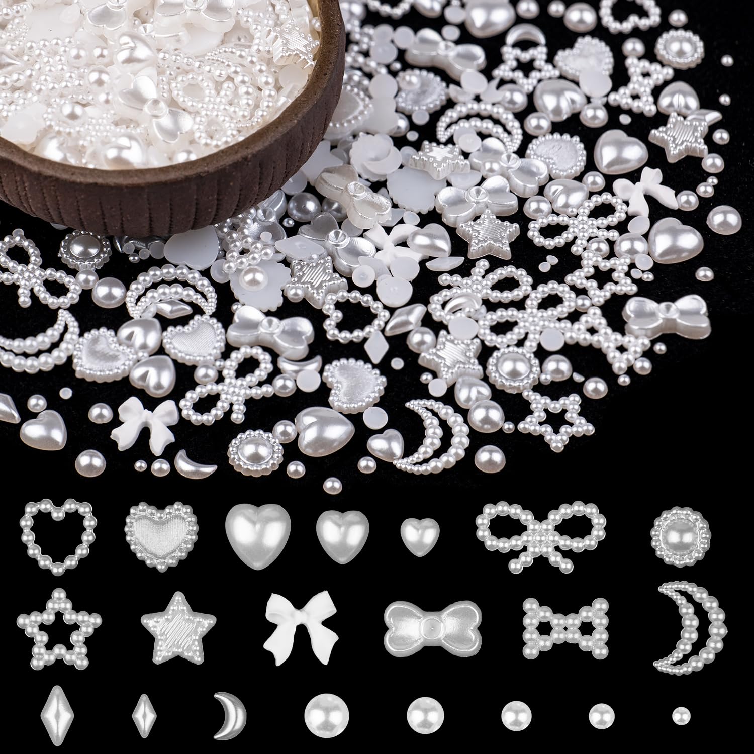 - What You Will Receive: You will get a pack of White multi styles 3D nail art charms and flatback half round White pearls, a pc of tweezer and a pc of pickup pencil