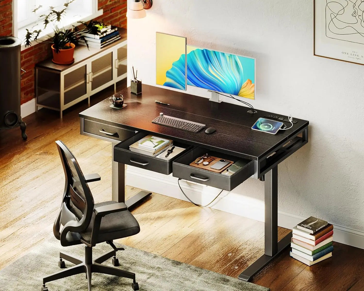 Electric Standing Desk With Drawers, 47 Inch Height Adjustable Small Desk With Power Outlets, Sit Stand Table, Writing Computer Desk For Home, Office, Workstation, Black