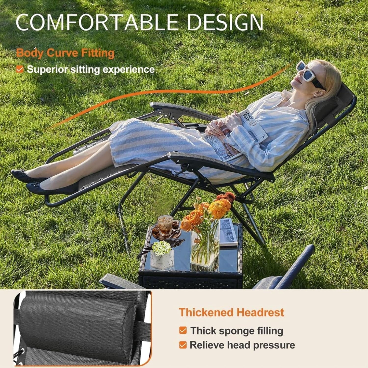 Atilioo’s Zero Gravity Chairs Set of 2 combines premium alloy steel frames with a 300-pound weight capacity, ensuring durability for outdoor use. The adjustable folding reclining lounge chair design allows easy transport and storage, perfect for beach outings, camping, or family gatherings. With a backrest lockable at 0-160 degrees and an adjustable headrest, it offers personalized comfort, while breathable mesh fabric stays cool and cleans easily. The ergonomic design provides lumbar support, and the detachable tray with compartments keeps drinks and snacks handy. Ideal as a beach recliner chair, this lightweight set brings hassle-free relaxation to patios, lawns, or shores.