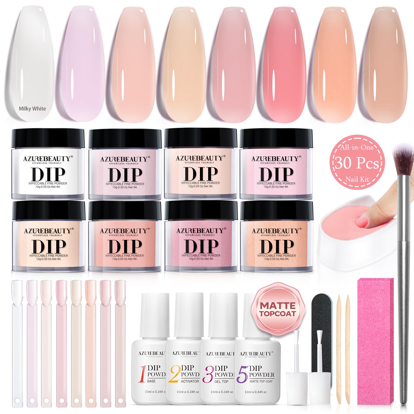 - 【Upgraded 30Pcs Starter Nail Kit】Up to 30 Pcs complete dip nails powder starter kit contains 8*10g (0.33oz) color powder, 4*10ml dip powder liquid set(base coat/activator/top coat/matte top coat), 2*liquid brush replacement, 1*nail brush,1*nail file, 1*nail polishing block, 1*dip powder recycling tray. 🎁What's more, 10*nail sticks and 2*orange wood stickers are added to the kit for color testing as well as ease of use.🎁