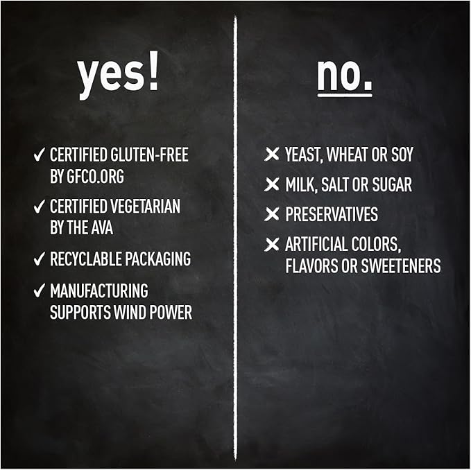 - CONTAINS NO GMOs! Also NO - Yeast - Wheat - Soy - Milk - Salt - Sugar - Preservatives - Artificial Colors - Artificial Flavors - Artificial Sweeteners.