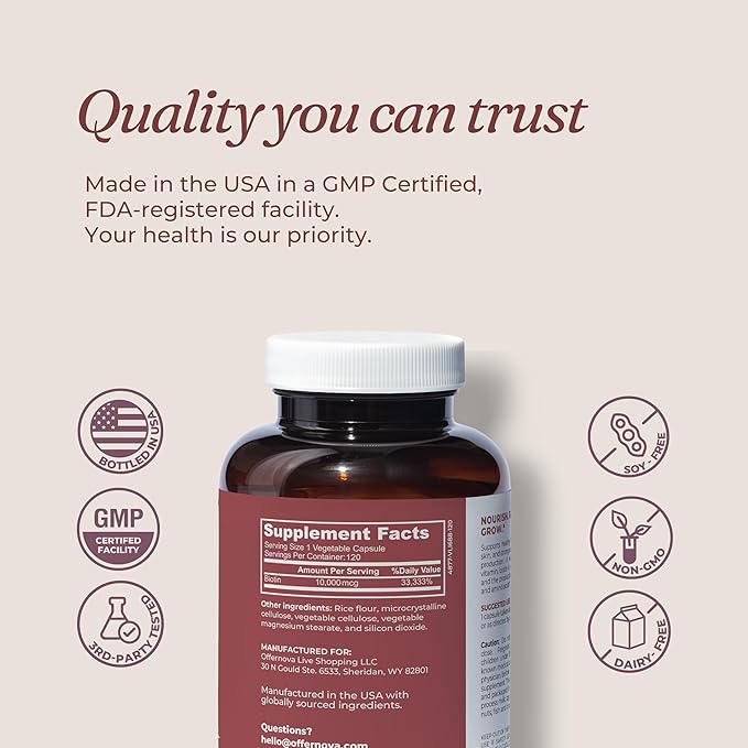 - Nutrición Natural: embalada con 10,000 mcg de biotina, nuestra fórmula avanzada es más eficaz y eficiente para ayudar a todo tu cuerpo por dentro y por fuera. Contiene 120 tabletas que tomando 1 tableta al día rendirá hasta por 4 meses.