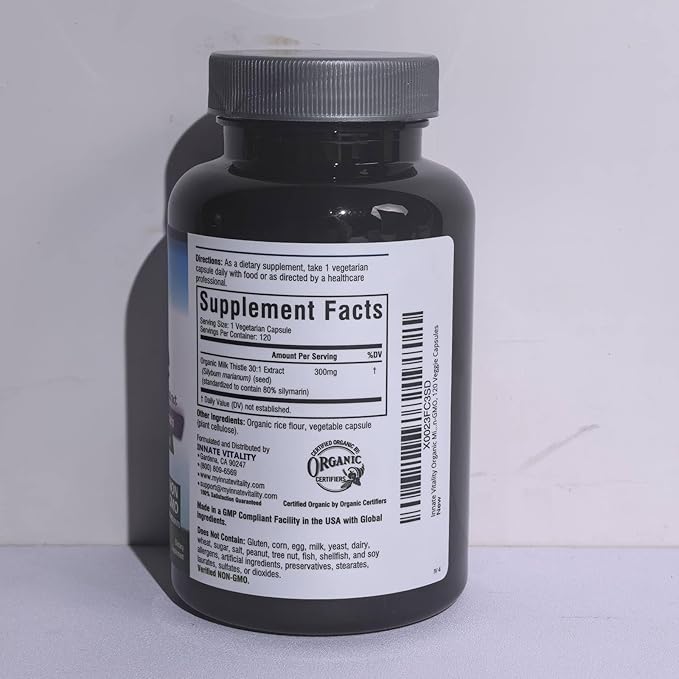 Innate Vitality 30:1 Organic Milk Thistle Supplement, 9000mg Equivalent (300mg Extract), 80% Silymarin Flavonoids, Liver Health, Detox & Cleansing, Made in USA, Non-GMO, 120 Veggie Capsules