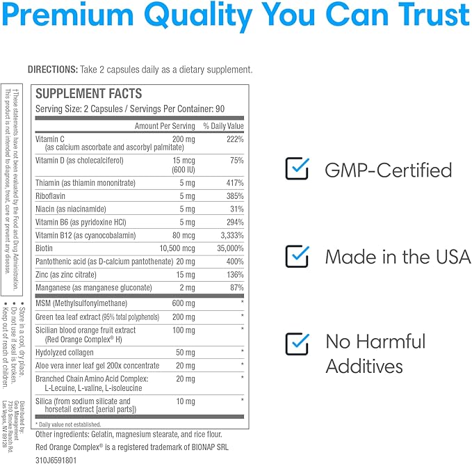 - Special Ingredients : Sicillian Blood Orange Extract, Green Tea Leaf Extract, Methylsulfonylmethane, Biotin, Sulfur, Vitamin C, vitamin D, zinc and manganeseSicillian Blood Orange Extract, Green Tea Leaf Extract, Methylsulfonylmethane, Biotin, Sulfur, Vitamin C, vitamin D, zinc and manganese