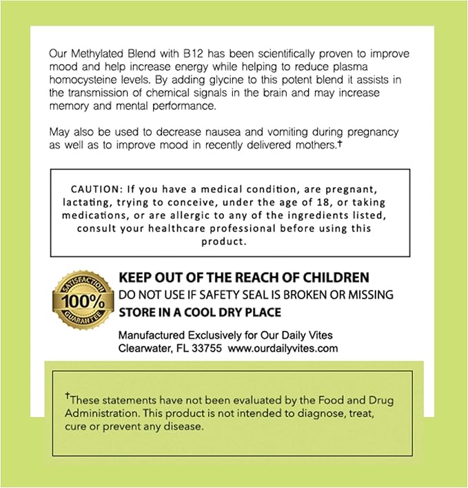 - Health benefits: Our methylated b12 supplement with vitamin B12 is scientifically proven to improve your mood and energy. We have added glycine to this potent blend that may assist in the transmission of chemical signals in the brain.