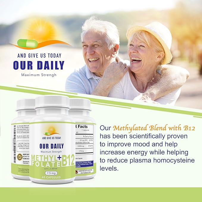 L-Methylfolate 7.5 mg + B 12 (1000 mcg) - 60 Capsules - Methylated & Glycine - Boost Mood, Energy & Memory - Immune Support & VItamin Supplement for Men & Women - Non-GMO, Vegetarian Capsules