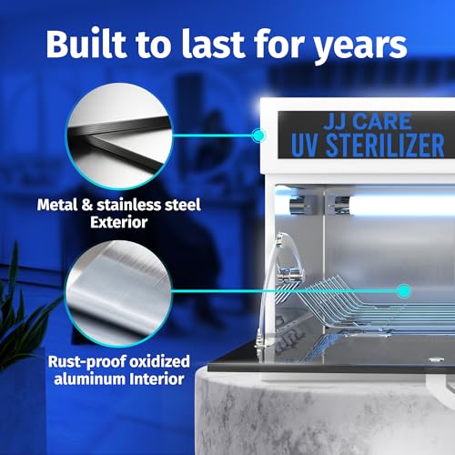 - No Heating Required – The JJ CARE sanitizer box utilizes advanced 254 nm UV technology to sanitize items from every angle, ensuring complete cleanliness without any odor. Built with durable, rust-resistant stainless steel, it features two removable trays, a replaceable bulb lasting up to 1,000 hours, and a sturdy glass door for added durability.