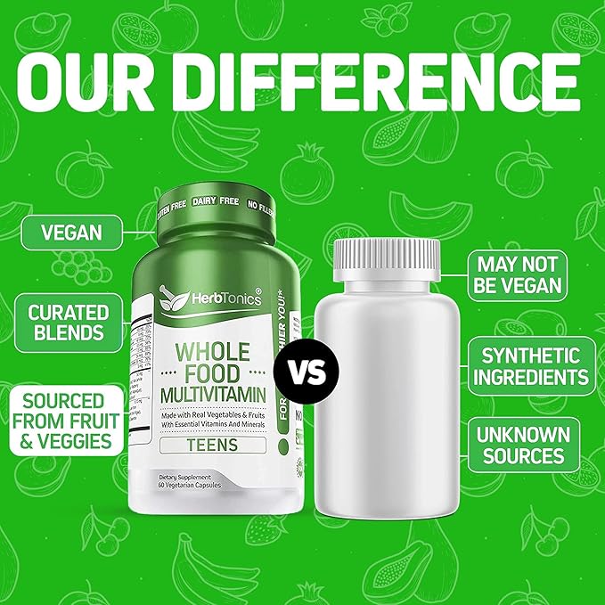 - WHOLE FOOD POWERHOUSE - NOT SUGARY GUMMIES: Get potent, plant-based nutrition from 62 real fruits, veggies & superfoods packed into one easy-to-swallow capsule daily. Vegan, Non-GMO, Gluten/Dairy/Soy Free. Delivers essential nutrients without the artificial colors, sweeteners, or fillers found in many teen gummies.