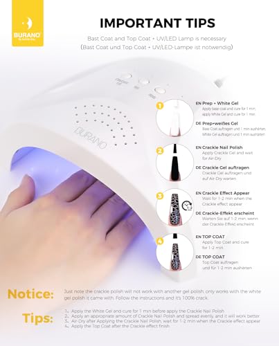 - For All Nail System, suitable for acrylic nail, extension gel, nail polish and so on. Please use BURANO white gel polish in this set as the base color, then use the crack gel polish, then it can crack more beautiful