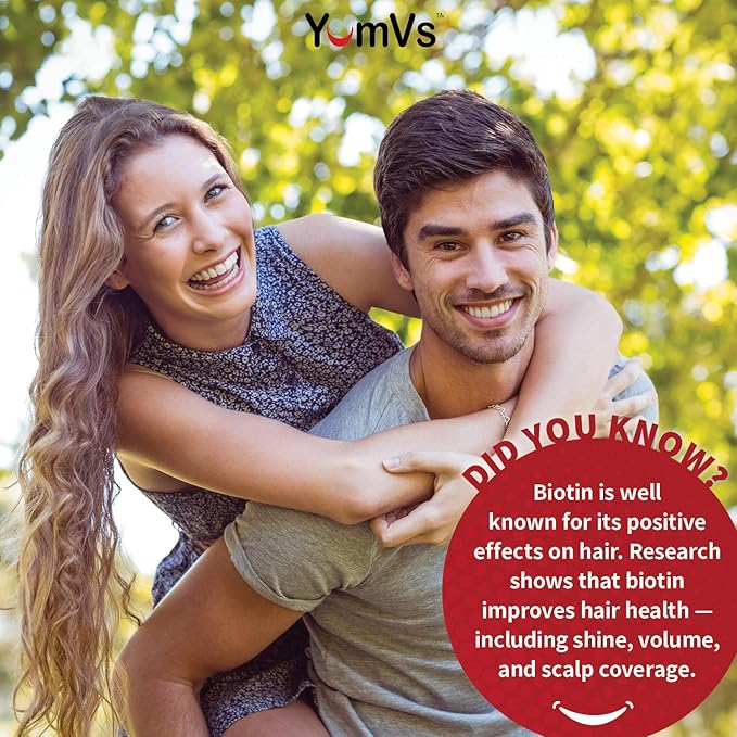 - BIOTIN VITAMINS FOR HAIR, SKIN & NAILS Daily dietary supplement for adults, YumVs raspberry flavor vitamin gummies support Hair, Skin & Nail health. Our maximum potency Biotin vitamins contain 10,000 mcg per serving β a daily boost for your overall health!