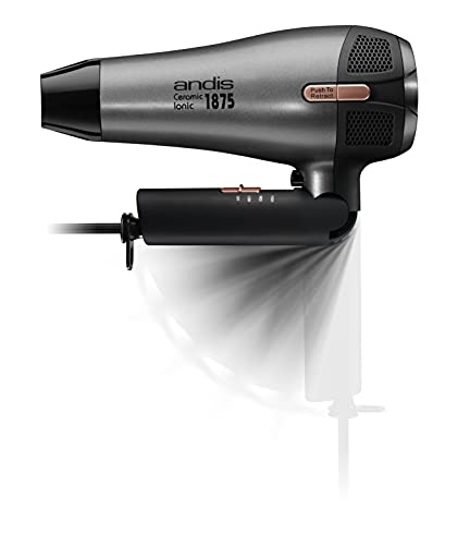 Andis 80280 Fold-n-go 1875 Watt Ceramic Ionic Dryer, Retractable Cord, Lightweight with Professional Blowout Results, Quick Drying Blow Dryer, Black/Silver