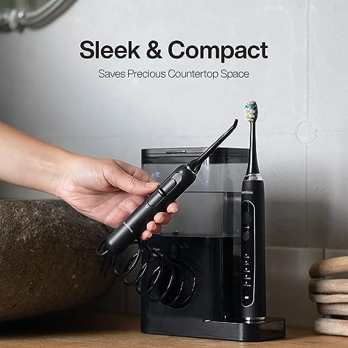 - What’s in the Box – 1 Home Dental Center Pro Countertop Setup, 1 Black Series Pro Electric Toothbrush, 6 ProFlex Brush heads, 2 water flosser jet tips, 1 tongue scraper, 1 power adapter, warranty card, and user manual.
