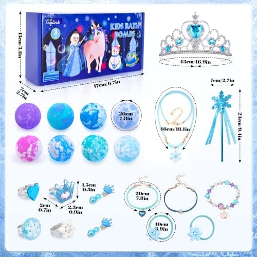 - Bath Bombs with Toys Inside - Our kids bath bomb gift set includes 8 different colored ball-shaped bath bombs with jewelry inside. 1 necklace, 3 bracelets, 4 rings, 2 hair ties, 1 pair of earrings are inside the bath bombs. Additional toys including crown and magic wand fulfill princess dream perfectly when bathing. Manufacturer recommended age: 3 years and up