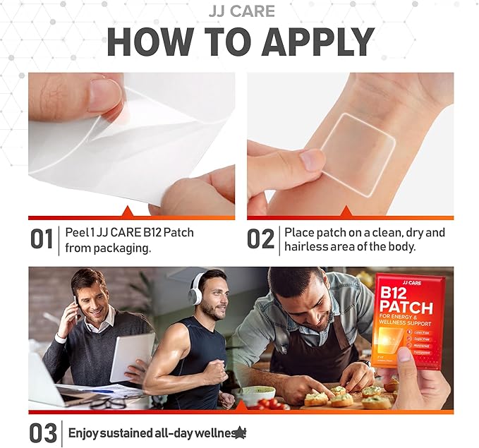 - ✅ DAILY WELLNESS – JJ CARE B12 Patch enables you to feel great all of the time! Helps in conquering sluggish afternoons with the transdermal JJ Care B12 patch. Each patch is infused with all-natural ingredients to give your health that much-needed pick-me-up.