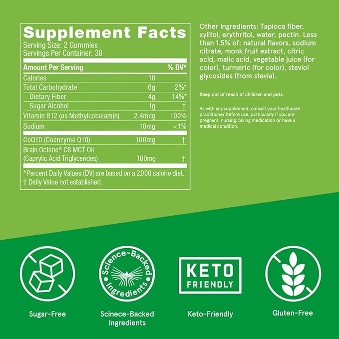 - Give your body its daily boost with this sugar-free gummy. CoQ10 and 100% Daily value of vitamin B12 work together to help support your cellular energy production, while Brain Octane Oil provides sustained energy. Your go-to blend for daily energy support: 100% Daily Value of B12, 100mg CoQ10, 100mg Brain Octane Oil