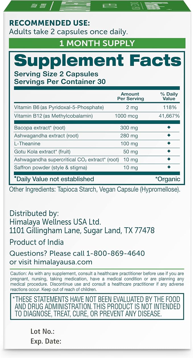 Himalaya Hello Alert Mind with L-Theanine, Ashwagandha, Bacopa, Vitamin B6 & B12, for Energy, Focus & Attention, Vegan, Gluten Free, 60 Capsules