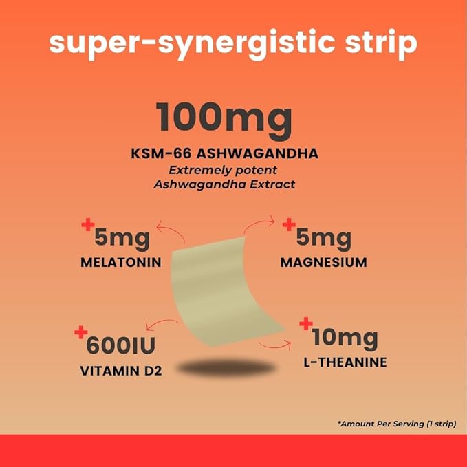 - Key Ingredients: Each strip contains 100mg of premium KSM-66 Ashwagandha, enriched with L-Theanine for calmness, Melatonin for restful sleep, and Vitamin D2 to support your immune health—all in a vegan, sugar-free formula.