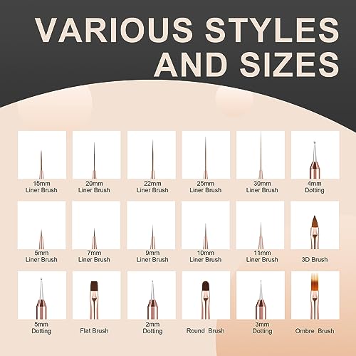 - 💗【Professional Nail Liner Brushes】: This art nail brushes comes with 5 pcs liner brushes in double-ended: 5/7/9/10/11/15/20/22/25/30mm. 4 Pcs dual-ended for 2/3/4/5 mm dotting pen with 3d, flat, round, ombre shape brush. Meets various of different nail art needs. Perfect for tiny details, delicate and exquisite patterns, fine lines of nail designs.