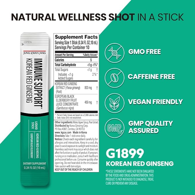 - Contains an effective dosage of elderberry, which is rich in vitamin C, antioxidants, and known for their immune-boosting properties. Additionally, it is infused with high-quality Korean Red Panax Ginseng, renowned for its ability to support the immune system and combat fatigue. By harnessing the benefits of these natural ingredients, our JungKwanJang Immune Sticks offer a comprehensive approach to enhancing your immune health and fighting off tiredness and exhaustion.