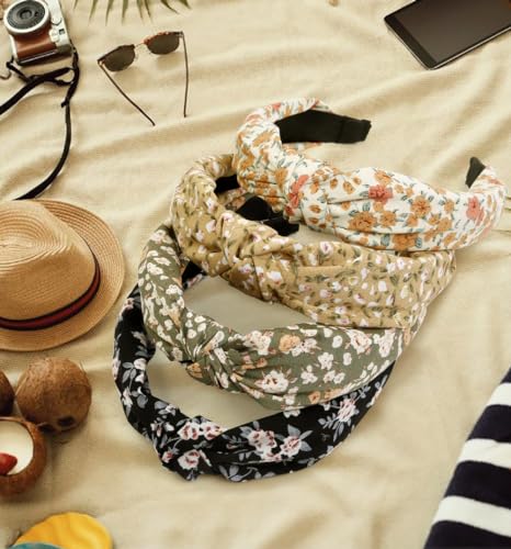 Huachi Headbands for Women and Girls, 4 Packs Fashion Flower Printed Knotted Head Bands for Women’ s Hair, Non Slip Boho Wide Thick Top Knot Hairbands, Womens Trendy Hair Accessories
