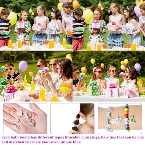 - Jewelry Inside: Enchant bath time for your girl with fizzy bath bombs. Each bursts open to reveal a treasure trove: 10 rings, 10 hair ties, 10 bracelets in random styles. Her eyes will sparkle as she uncovers her jewel, a magical unboxing experience