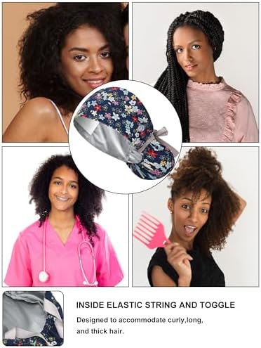 6 Pcs Satin Lined Scrub Caps Women Nurse Surgical Hat with Buttons Ponytail Working Adjustable Pouch Tie Back