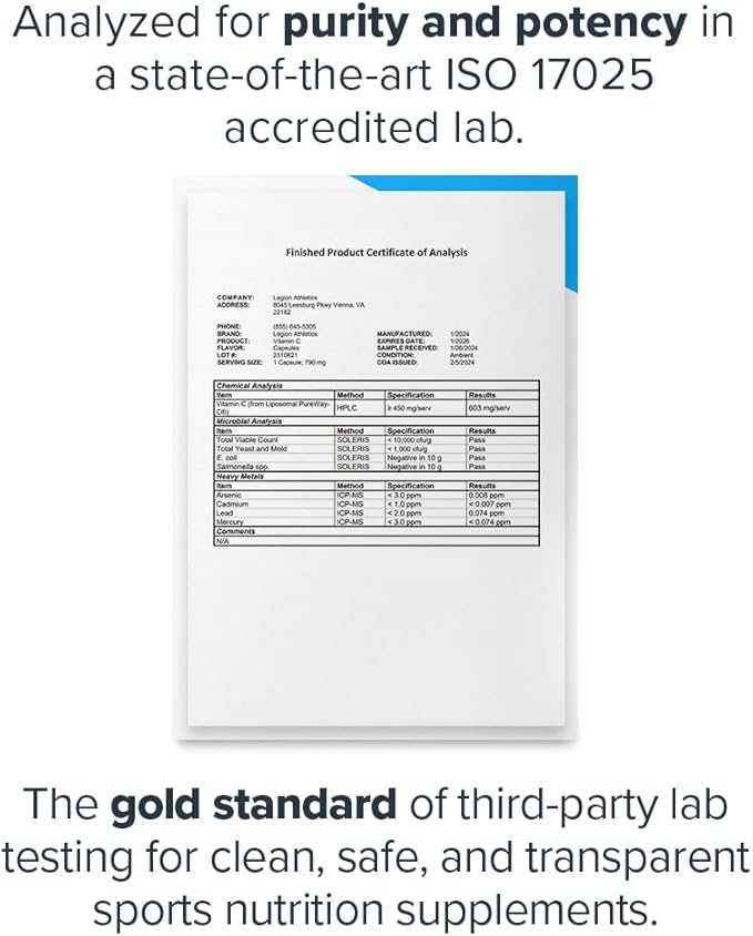 - Tested for purity and potency in an ISO 17025 accredited third-party lab. Every bottle of our vitamin C capsules is guaranteed to provide exactly what the label claims and nothing else.