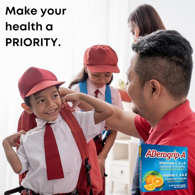 Aderogripa Immune Support Vitamins C, A & D | Liquid Supplement | 10 Natural Orange Flavor Ampoules | Boost Your Immune System | Box of 10 x 10ml Ampoules | Suplemento en Ampolletas