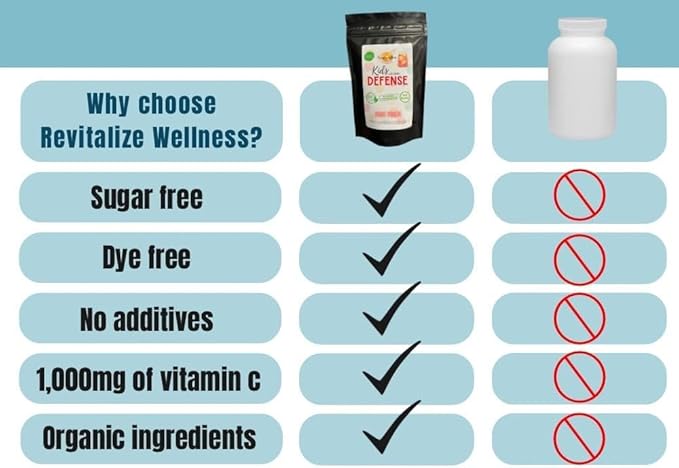 - Revitalize Wellness Kid's Defense powder contains 1,000 mg of Vitamin C and 200 mg of Vitamin B3. It’s the perfect combination to support your family's immune system. Our blend is suitable for orthomolecular dosing.