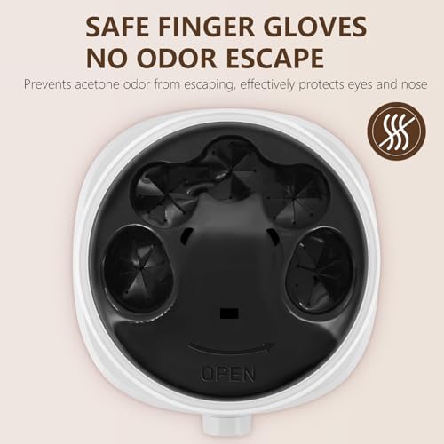 - SAFE & NO ODOR ESCAPE: There is a sealed finger cover that stops the nail polish remover odor from coming out, so it won't harm your eyes and nose. The nail soaking bowl is made of is flame retardant and high temperature resistant plastic, safer to use.