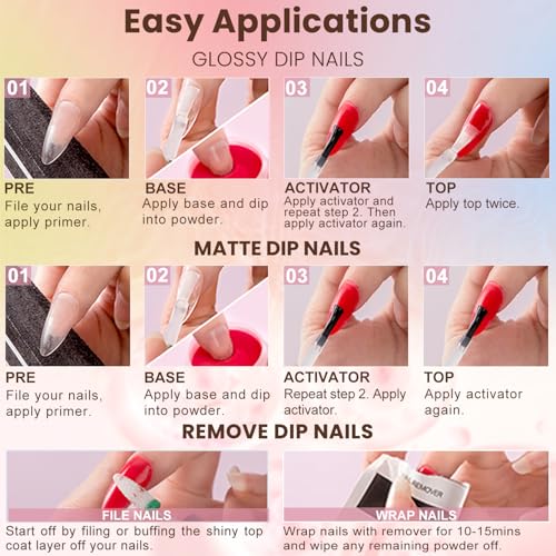 - Long Lasting: Experience durable, chip-resistant nails for over 28 days with our dip powder set. Enjoy flawless nails with no breakage or peeling. This nail powder dipping kit doesn’t need a lamp.