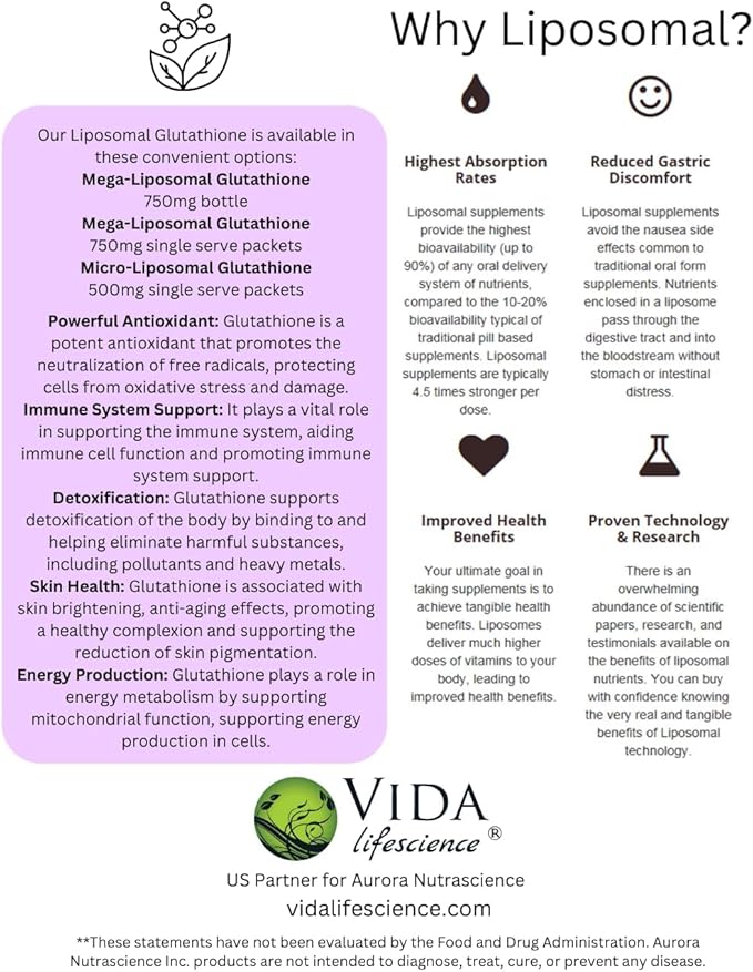 Aurora Nutrascience Mega-Liposomal Liquid Glutathione, Immune & Antioxidant Gut Health Support Supplement, 750 mg per Serving, Non-GMO, Sugar-Free, 10 Single Serve Packets