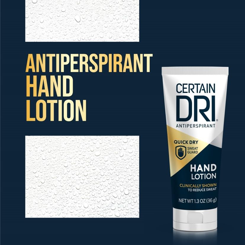 CERTAIN DRI Antiperspirant Hand Lotion – 24-Hour Sweat Protection for Excessive Sweating & Palmar Hyperhidrosis – Fast-Drying, Non-Greasy, Fragrance-Free Formula – Dermatologist-Tested, (1.3 oz)