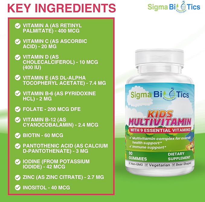 - Essential nutrients for kids: Packed with 9 essential vitamins, these kids multivitamin gummies support healthy growth, vision, and immune function, making them perfect daily gummies for overall development in children aged 2 years and older.