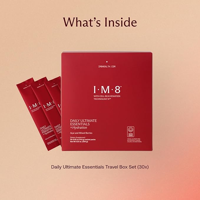 - DAILY ULTIMATE ESSENTIALS: Your daily foundation for energy, focus, digestion, and whole-body wellness support—in one delicious and easy-to-mix drink. IM8 Daily Ultimate Essentials is a science-backed, all-in-one supplement for men and women designed to simplify daily nutrition with a science-backed formula. With 92 nutrient-rich ingredients, including essential vitamins, minerals, superfoods, and clinically studied doses of CoQ10 and MSM, IM8 supports hydration, digestion, energy metabolism, immune function, and overall well-being, including key nutrients for hair, skin, nails, joints, muscles, and heart health.