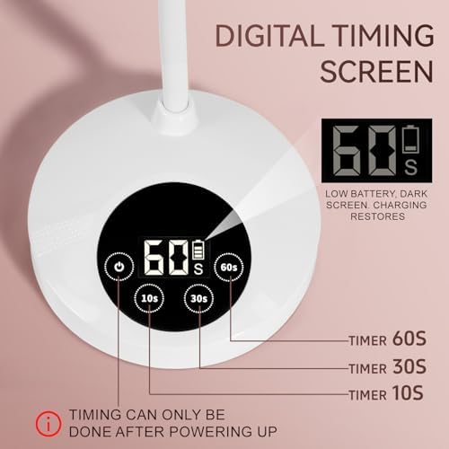 - 4 Timmer Settings & Auto Sensor: UV Light for Gel Nails have a LCD display timing screen with 3 timer settings (10s/30s/60s) and a default 90s sensor time. After turning on the switch, gently touch the light head, the uv lamp light comes on and starts counting down for 90s, easily curing all kinds of gel nails without hassle. (Please do not disassemble the lamp head!)