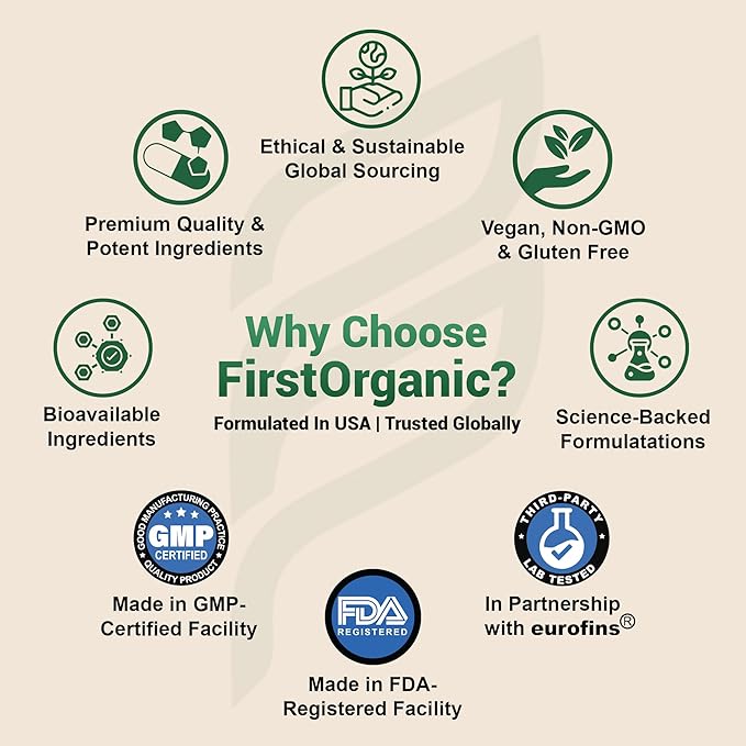 - Premium Quality & Advanced Formulation: Produced in a highly advanced facility with strict GMP quality controls, this supplement ensures high standards of purity, potency, and quality in every batch. FirstOrganic’s formula is expertly designed with carefully selected ingredients, providing a comprehensive approach to wellness.