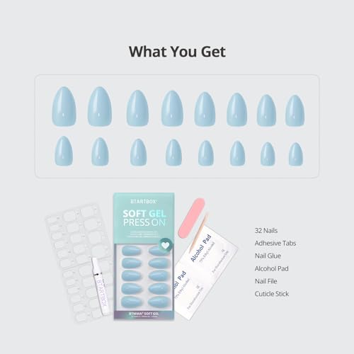 BTArtbox Press On Nails Short - Pastel Light Blue Almond Summer Press On Nails with Glue for Women, Opaque Soft Gel Glue On Nails in 16 Sizes - 32 Stick On Nails Kit, Sky Dash