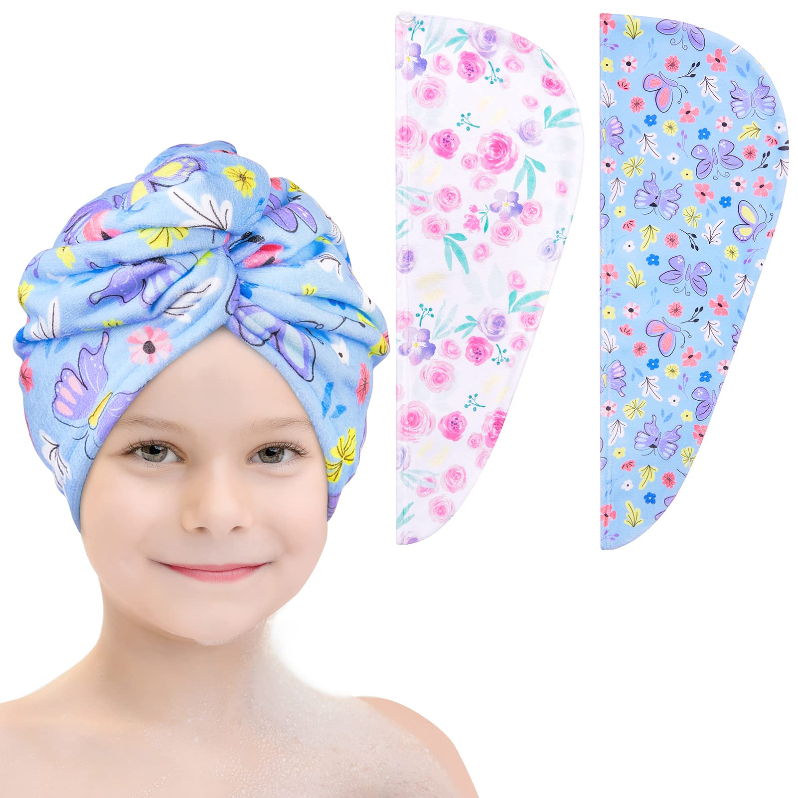 Basumee Microfiber Hair Towel Wrap for Kids 2 Pack Rapid Drying Hair Towel with Button Hair Turbans for Wet Hair Wraps Head Towel Wrap for Women and Girls, Flower