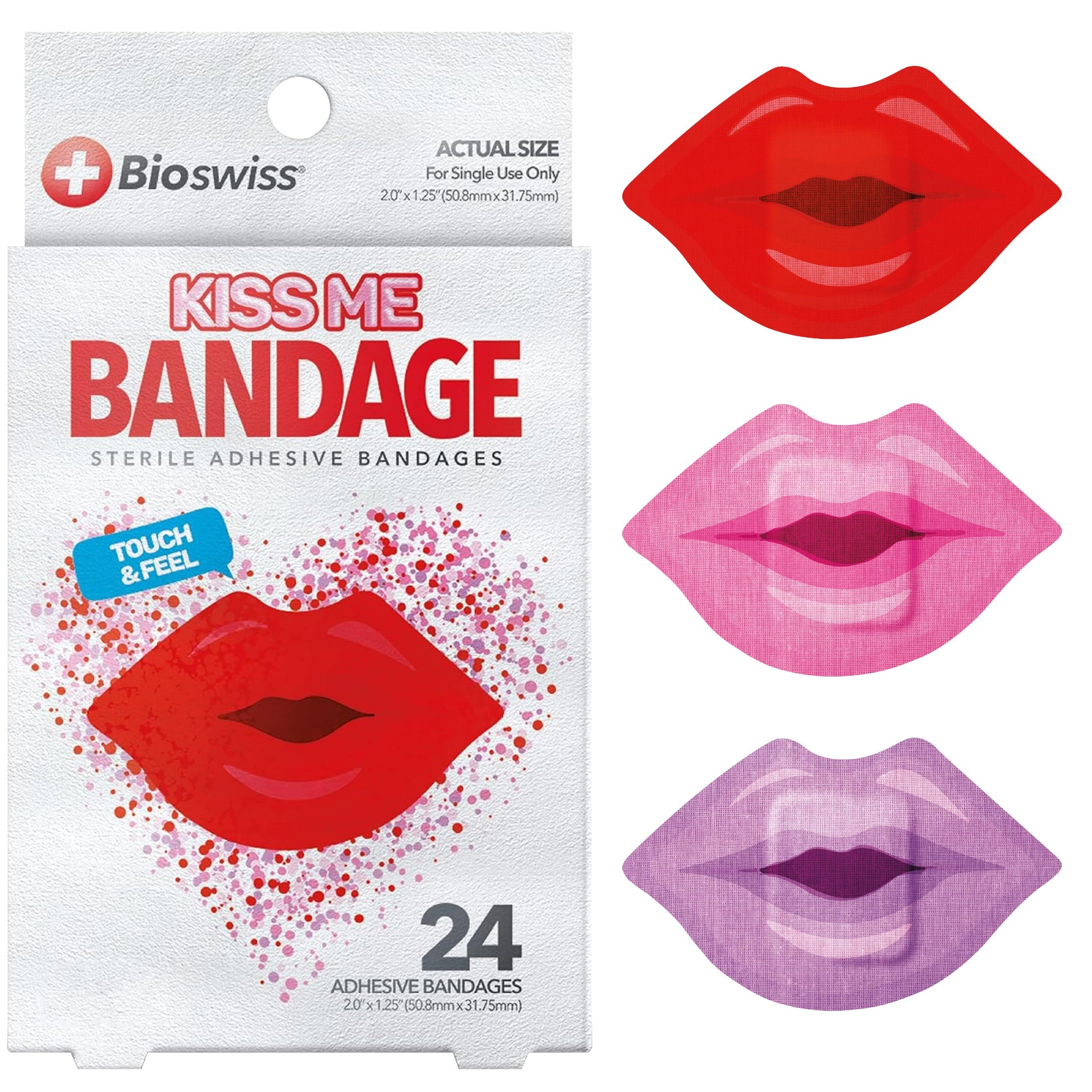 BioSwiss Bandages, Lips Shaped Self Adhesive Bandage, Latex Free Sterile Wound Care, Fun First Aid Kit Supplies for Kids, 24 Count