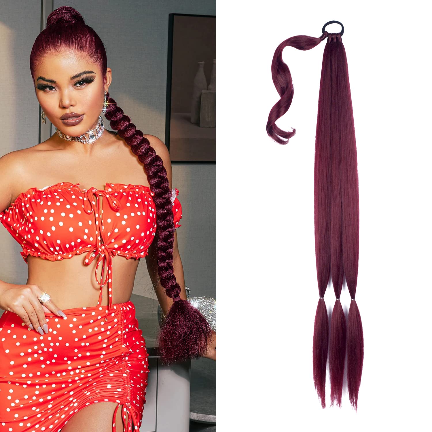 Burgundy Braided Ponytail Extension with Hair Tie Straight Wrap Around braided hair extensions Thick Soft Synthetic braided ponytail extension (Bug#)