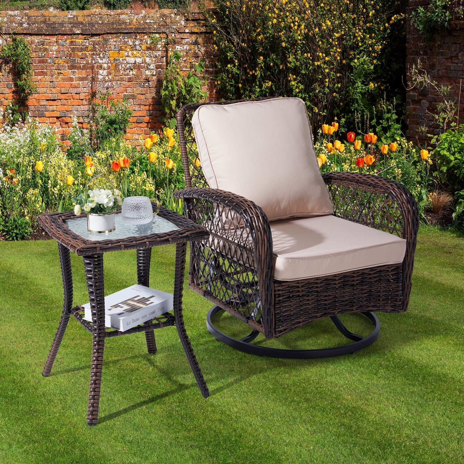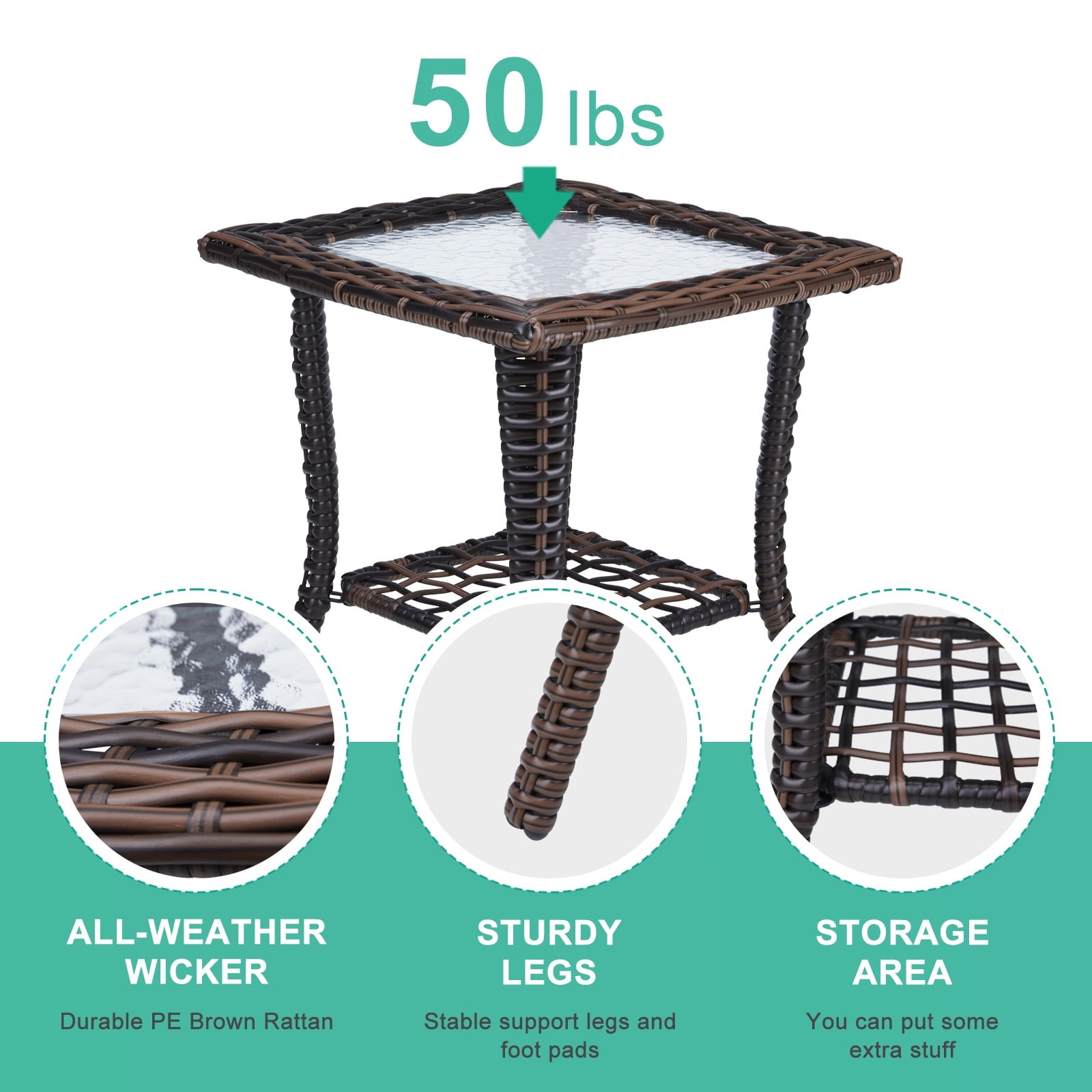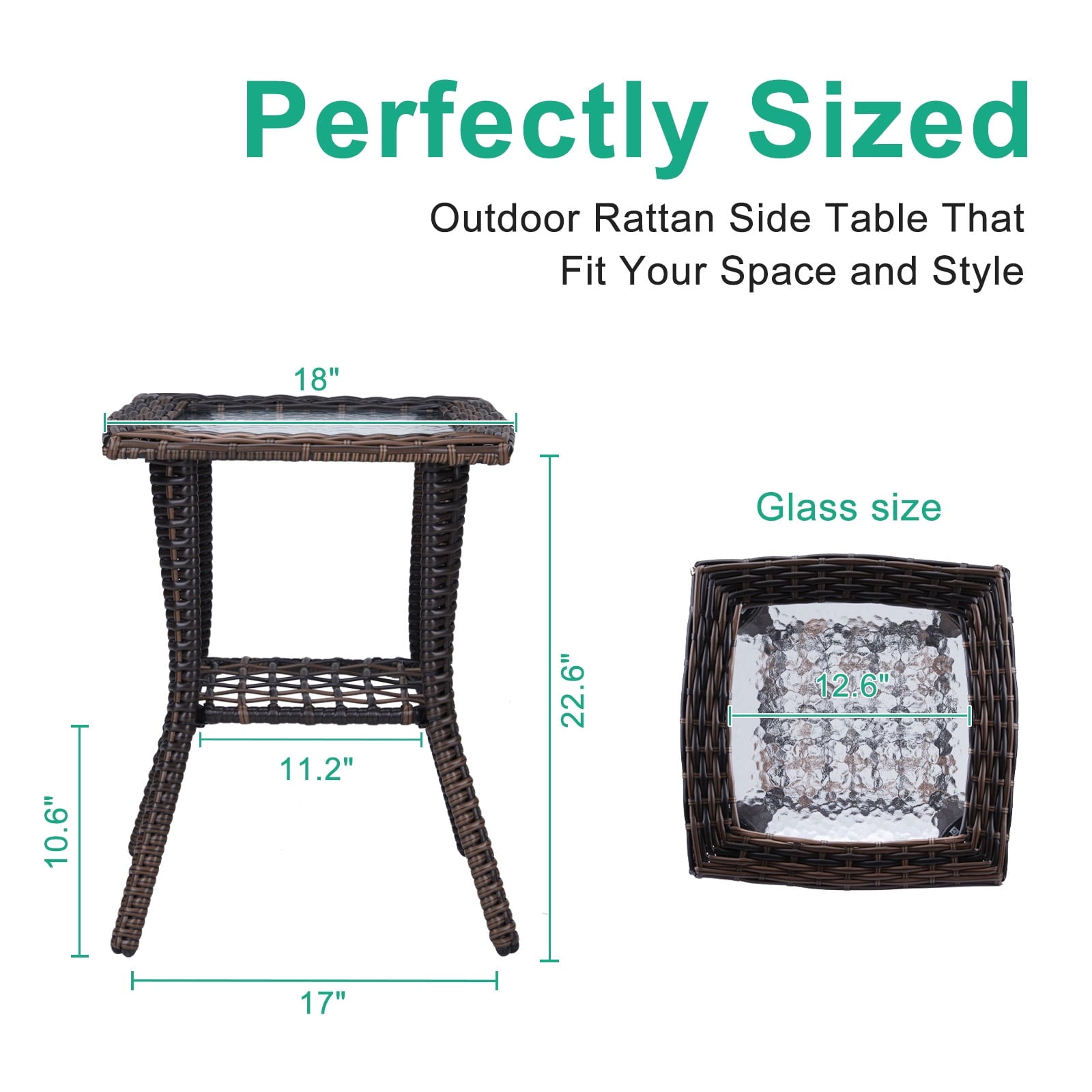 Buytoshop Outdoor Wicker Side Table, Rattan End Table with Glass Top, Patio Coffee Bistro Table for Garden Porch Balcony, Brown