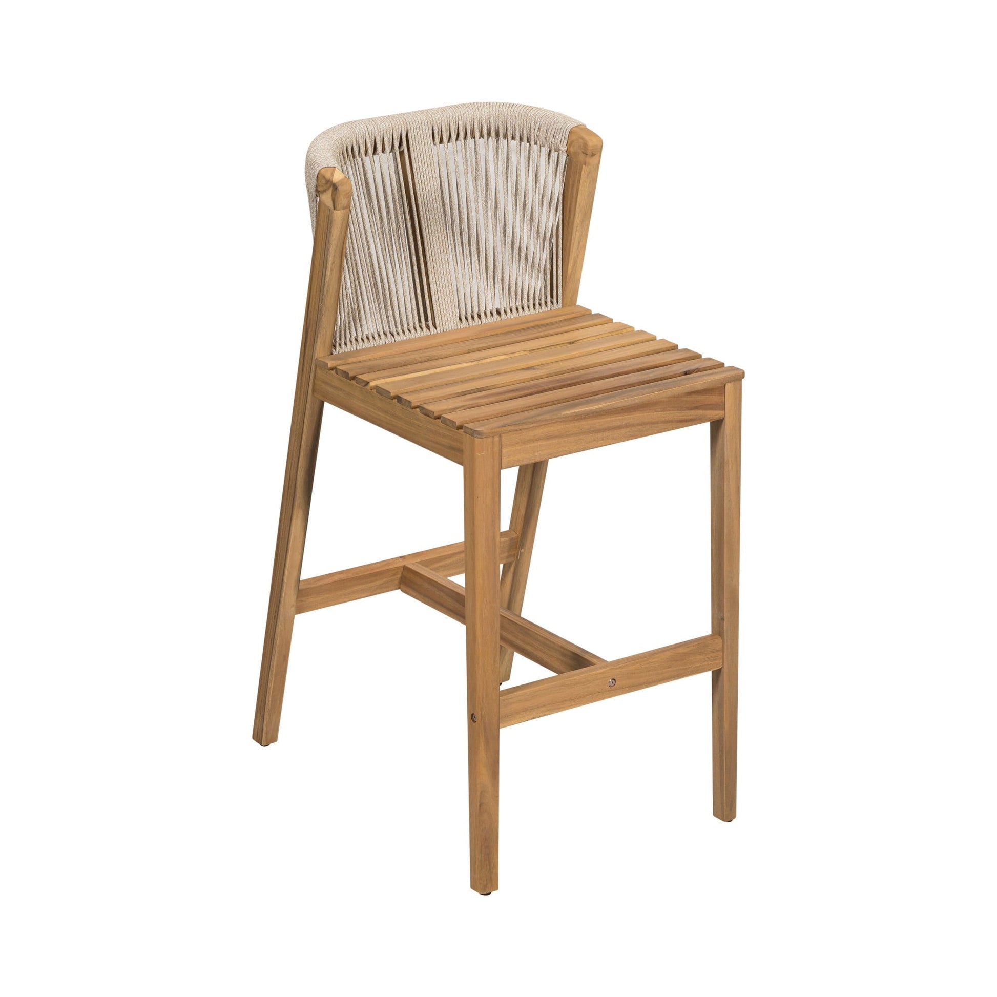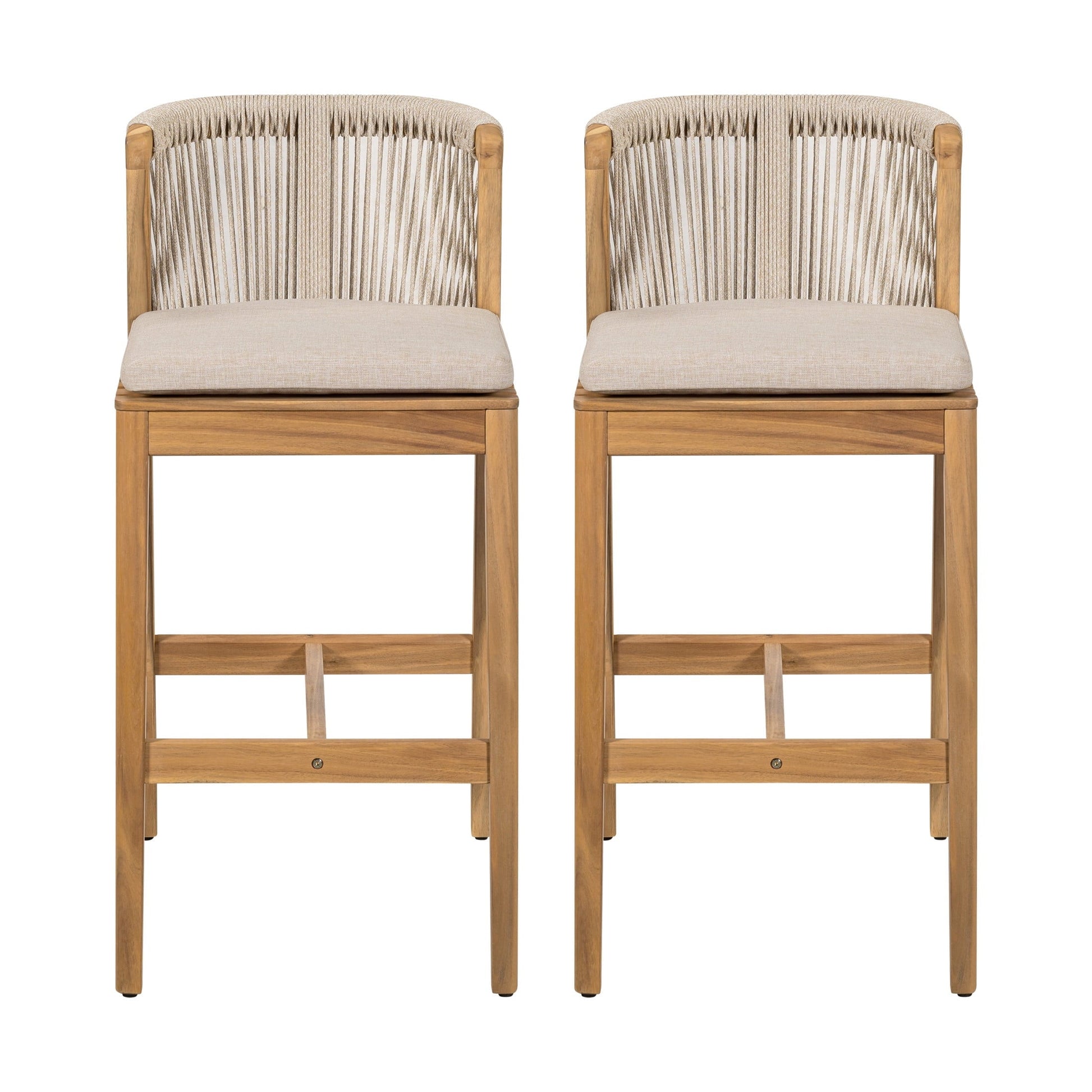 Bring rustic charm and comfort to your outdoor bar area with this acacia wood bar stool. Crafted from durable, anti-corrosion-treated acacia wood, this stool is built to withstand sun, moisture, and frequent use. The backrest features tightly woven ropes that are breathable and soft, offering a handcrafted texture and ventilation during warm weather. An ergonomic curved design supports your back from waist to shoulder, making it perfect for extended relaxation or conversation. The seat includes a removable cushion that attaches easily with magic tape for convenience and stability. With natural wood grain and a sturdy frame, this bar chair adds timeless appeal to any patio or outdoor setting.
