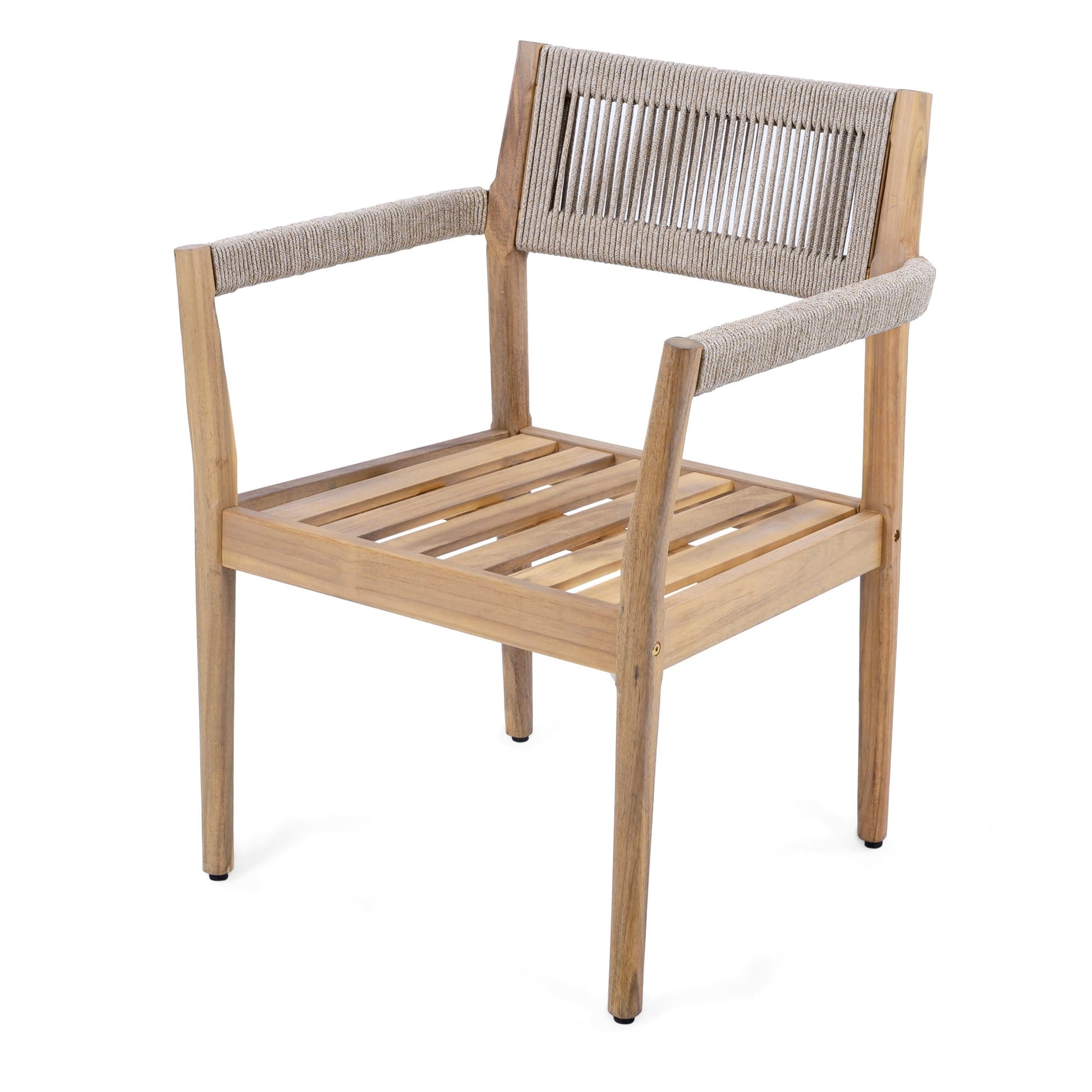 Enjoy stylish and comfortable outdoor dining with this acacia wood dining chair. Finished in a warm teak look, it features a handwoven beige rope seat and backrest that gently support your body. The 2-inch-thick cushion adds extra comfort, while the slightly reclined back and solid wood armrests offer relaxed support. Built to hold up to 400 lbs, the sturdy frame is also lightweight for easy movement around your patio, deck, or balcony. UV-resistant and quick-drying materials make this chair easy to maintain in any season. Whether placed around a table or used on its own, it brings a timeless and elegant touch to your outdoor space.