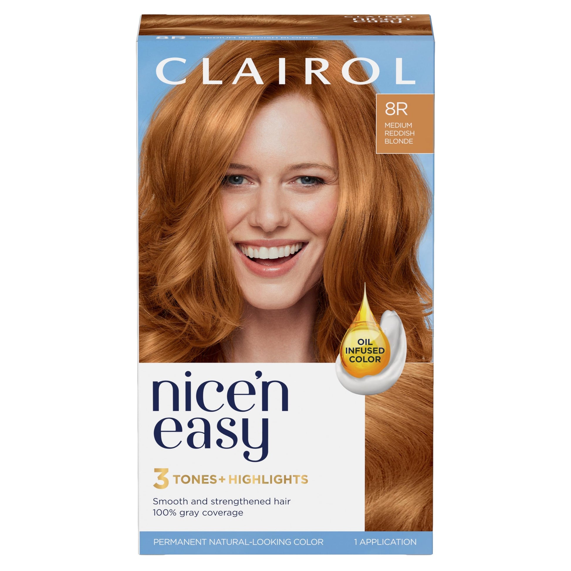 - Clairol Nice'n Easy 8R Medium Reddish Blonde. Permanent natural looking color with 100% gray coverage.