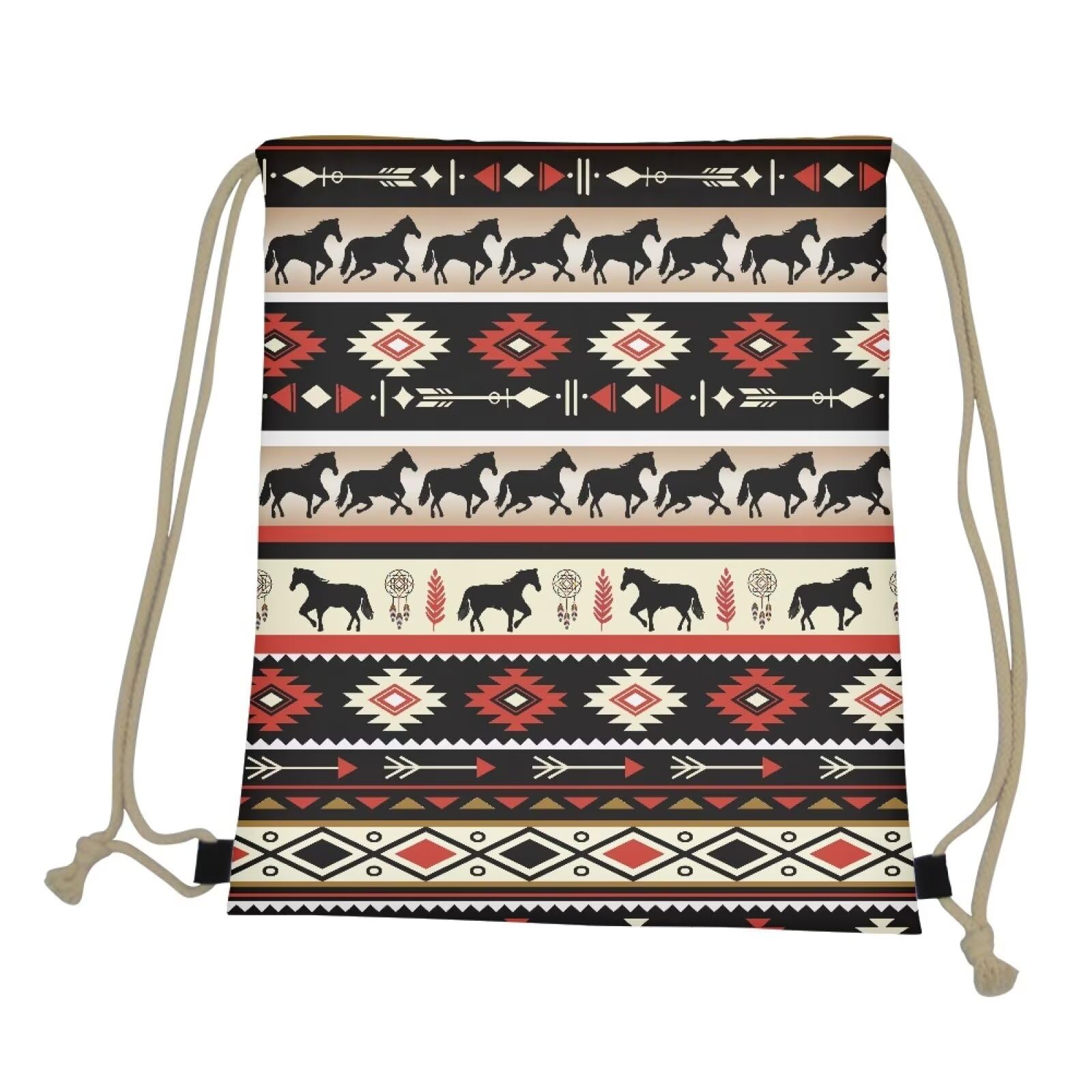 COEQINE Aztec Horse Small Drawstring Backpack For Girls Western Ethnic Gym Backpack for Women Sport Lightweight Foldable