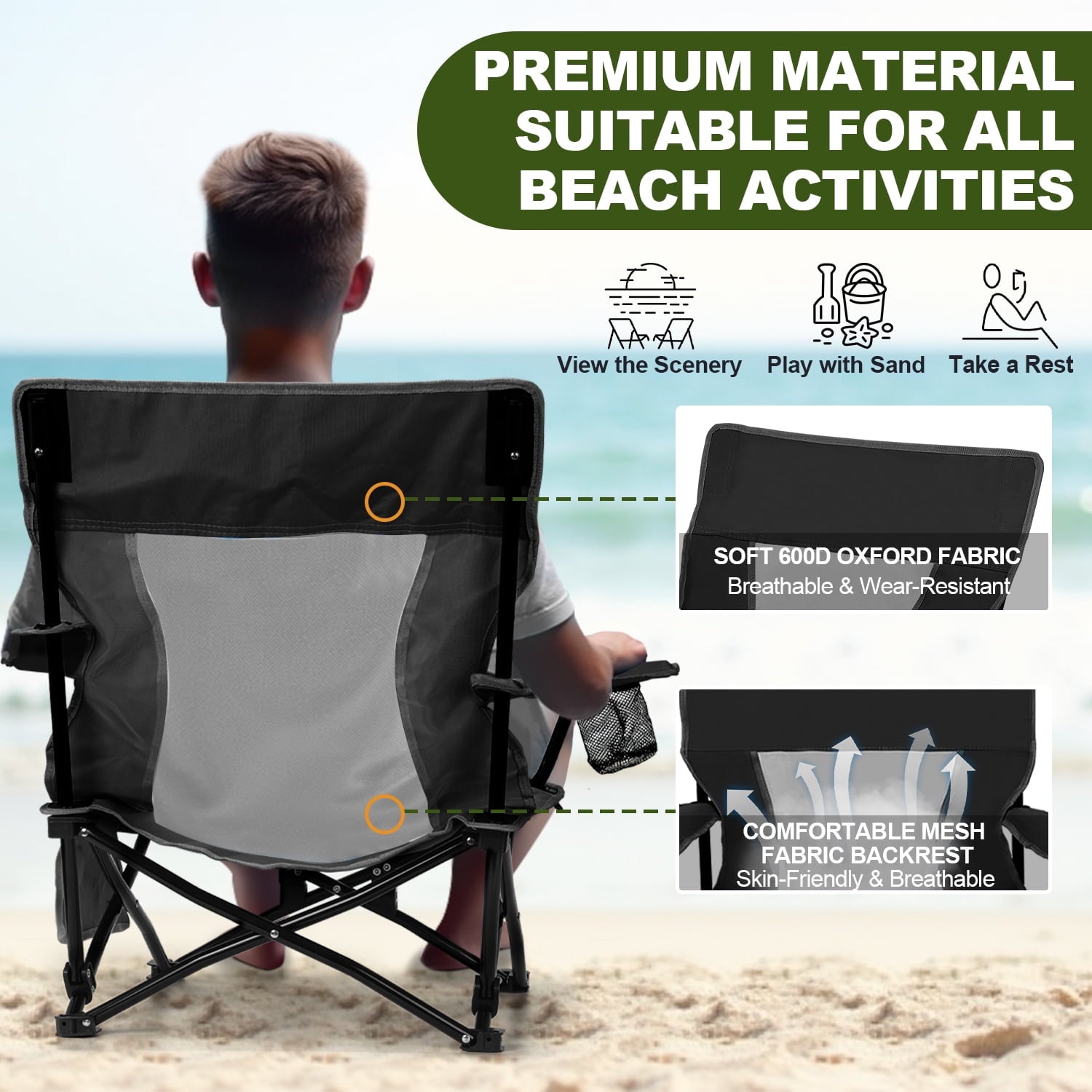 The folding backpack beach chair is constructed from high-density Oxford Fabric that is knowed for its exceptional durability, tear-resistance and breathability, perfect for withstanding the saltwater and rain while offering you a consistently cool and comfortable experience , The bracket of the beach chair is made of Aluminium Alloy, which is anti-pressure, resistant rust to enhance the longevity of the folding beach chair