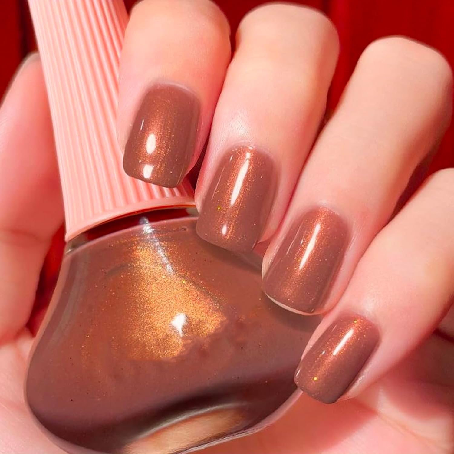 - Radiant Ochre Shimmer Nail Polish: Our luxurious Ochre is further enhanced by a vivid Ochre shimmer that effortlessly catches the light.